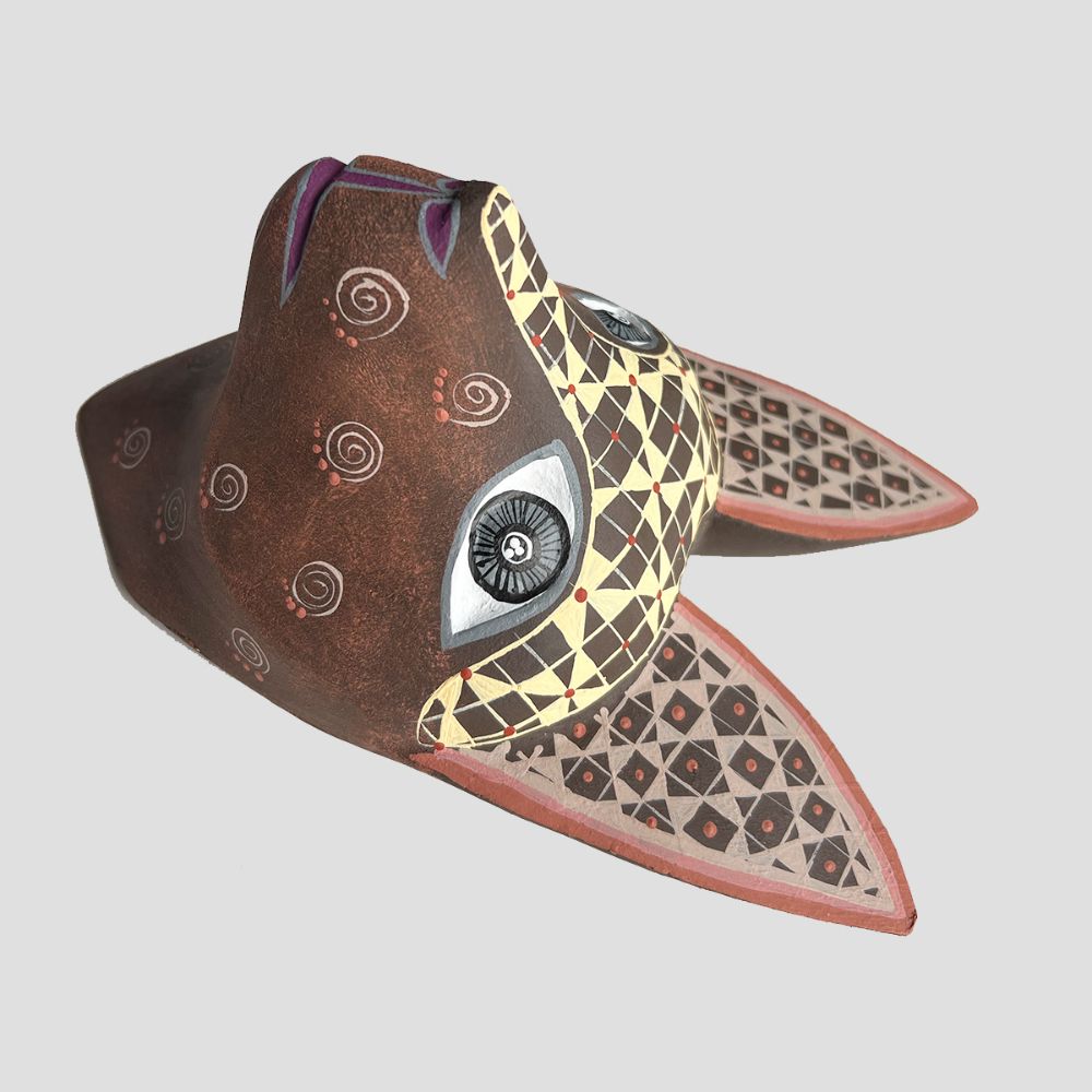 The Mascarita Lobo, made of zompantle wood and decorated by hand by skilled artisans from San Martín Tilcajete, Oaxaca, is an example of the artisanal excellence of the Casa Cruz family workshop. Founded by "the initiator", this workshop is distinguished by its meticulous carving process, creating unique and special designs by removing excess wood. These pieces, which represent the tradition of the nahuals of each person, where depending on the day and year you were born, there is a special animal that will protect you until the day you die. They function as decorative objects and are part of a series of collectible animals.