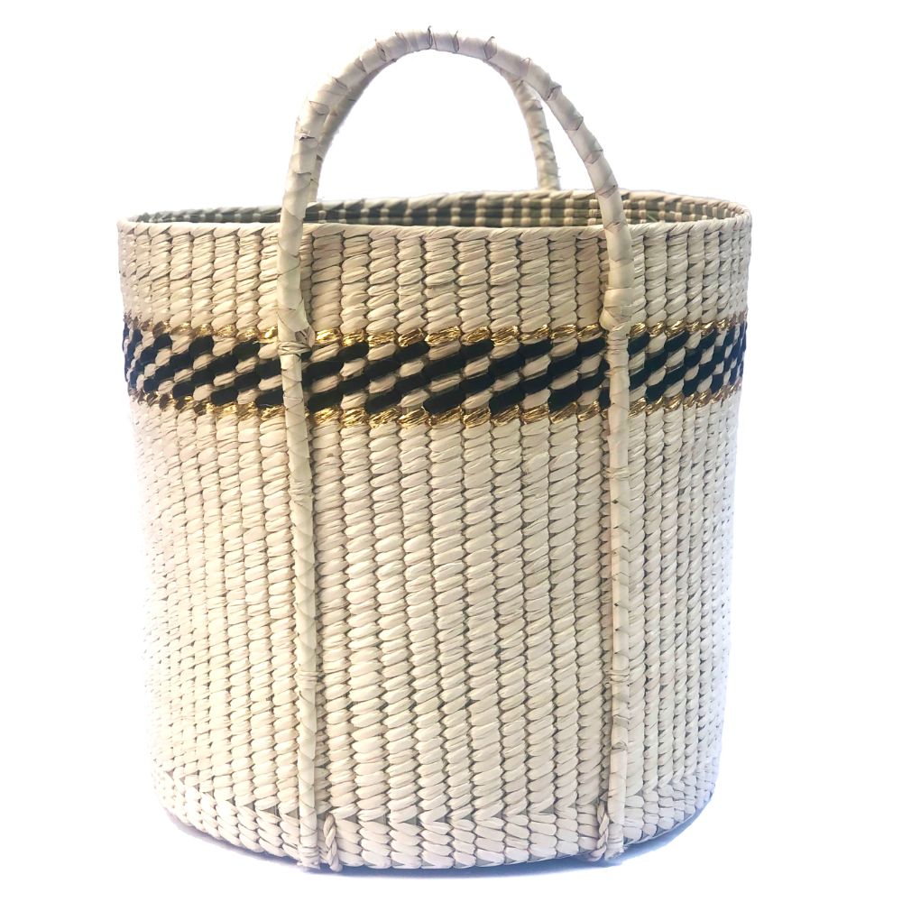 Esta canasta ha sido tejida con palma, lleva un entramado de cuero y listón metálico para decoración, y asas de cuero trenzadas para mayor resistencia. Requiere de gran habilidad por parte de los artesanos de Tlamacazapa en el estado de Guerrero para hacer este tipo de dibujos. Estas canastas son aptas para guardar o trasladar objetos ligeros.